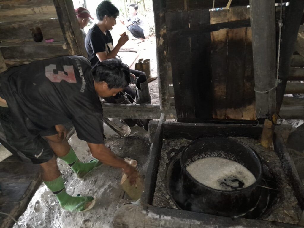 Dalam kondisi terbaik, ia bisa membawa pulang dua lodong nira. Air bening itu ia masak berjam-jam di saung, hingga buih menghilang dan warnanya berubah pekat kemerahan. Cairan manis itu kemudian dituang ke cetakan mirip congklak, dibiarkan mengeras, lalu dijual per hulu atau batok.